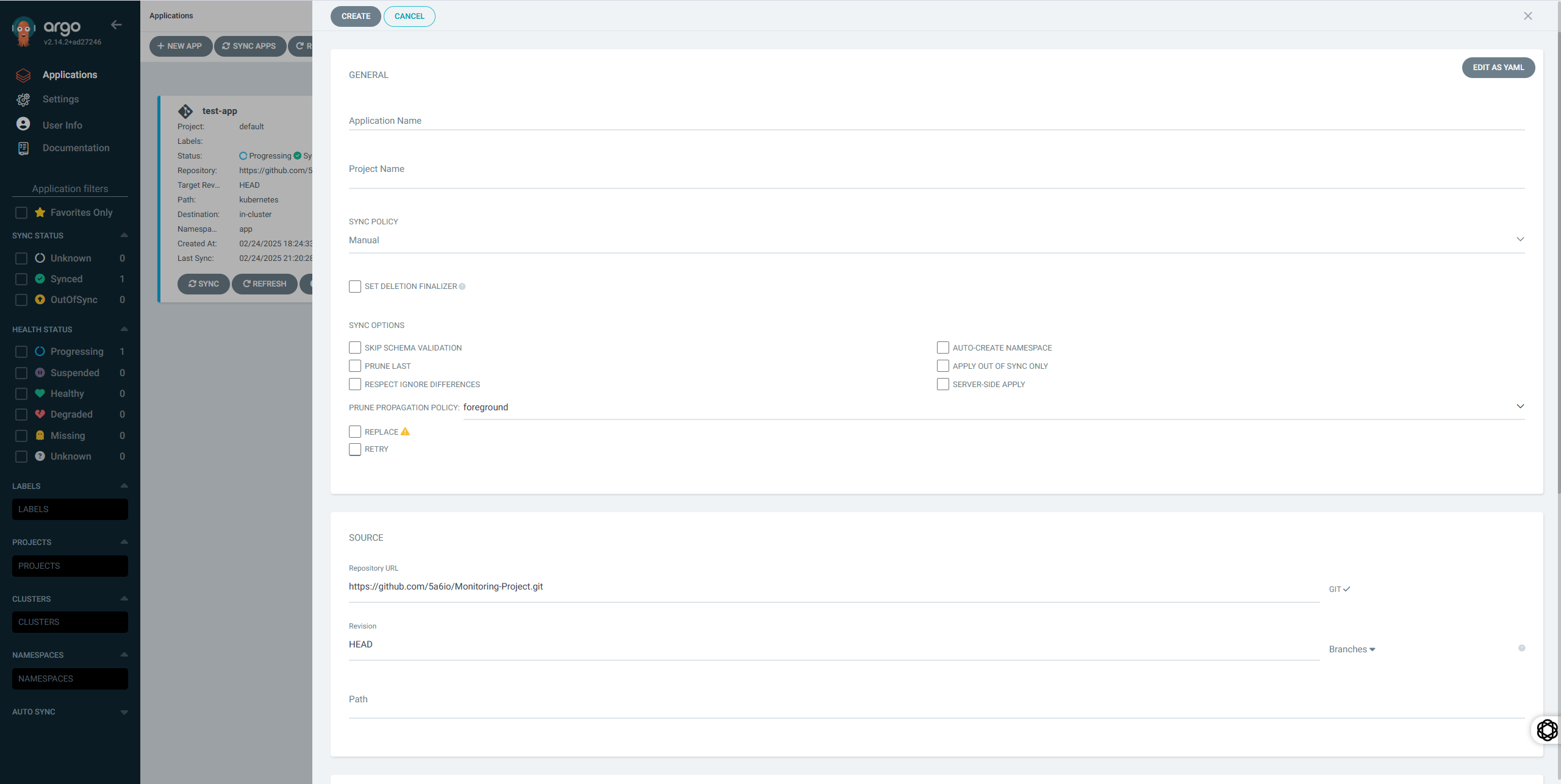 Application Name์ ์ค์ ํ๊ณ Project Name์ default๋ก ํ๋ฉด ๋๋ค. sync policy๋ manual๊ณผ automatic์ด ์๋ค. automatic์ผ๋ก ํ๋ ๊ฒฝ์ฐ์๋ git repository์ ๋ณ๊ฒฝ์ ์๋์ผ๋ก ๊ฐ์งํ์ฌ ๋ฐฐํฌ๋ฅผ ์งํํ ๊ฒ์ด๋ค. manual๋ก ํ๊ณ ์ถ๋ค๋ฉด Github action์ ์ฌ์ฉํ์ฌ sync๋ฅผ ์๋ํ๋ฉด ๋ ๊ฒ์ด๋ค.