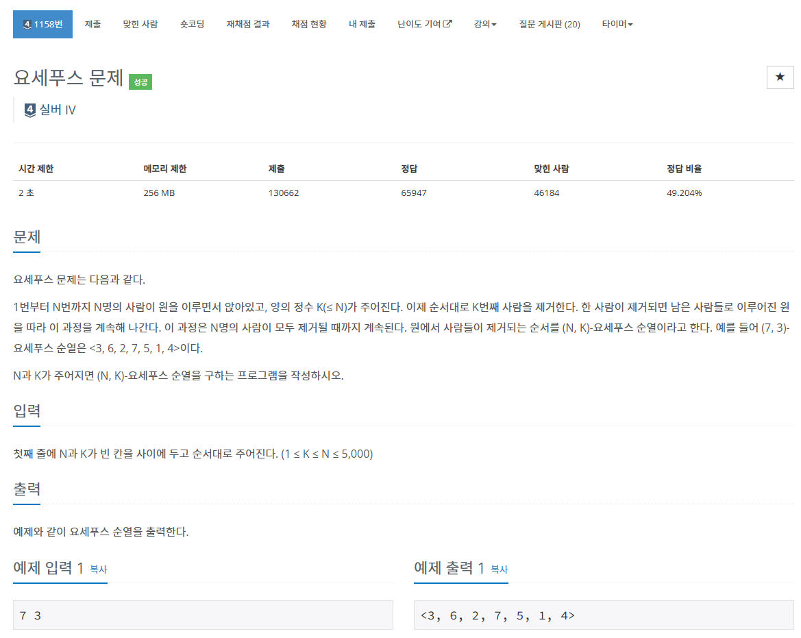 ๋ฌธ์ ์์ ๋ฅผ ์๊ฐํ๋ฉด ์ฒ์ ํ์ <1, 2, 3, 4, 5, 6, 7>์ด ์๋ค. ์ด ๋์ด๋ K = 3์ด๋ฏ๋ก K-1๊น์ง ๋นผ๋ฉด 1, 2๋ฅผ ๋นผ๊ณ ๋ค์ ํ์ ๋ฃ๋ ๊ฒ์ด๋ค. ๊ทธ๋ผ K๋ฒ์งธ ์๋ก 3์ด ๋์จ๋ค. ๊ทธ๋ฆฌ๊ณ ๋ค์ K-1๊น์ง ๋นผ๊ณ ๋ฃ์ผ๋ฉด ์ด ๋๋ <6, 7, 1, 2, 4, 5> ์์ผ๋ก ์ ๋ ฌ๋๊ณ K๋ฒ์งธ๋ฅผ ์ถ๋ ฅํ๋ฉด 6์ด ๋์จ๋ค. ์ด์ ๊ฐ์ ๋ฐฉ์์ผ๋ก ์ถ๋ ฅ์ ํ๋ฉด ๊ฒฐ๊ณผ์ ์ผ๋ก <3, 6, 2, 7, 5, 1, 4>๊ฐ ๋๋ค.