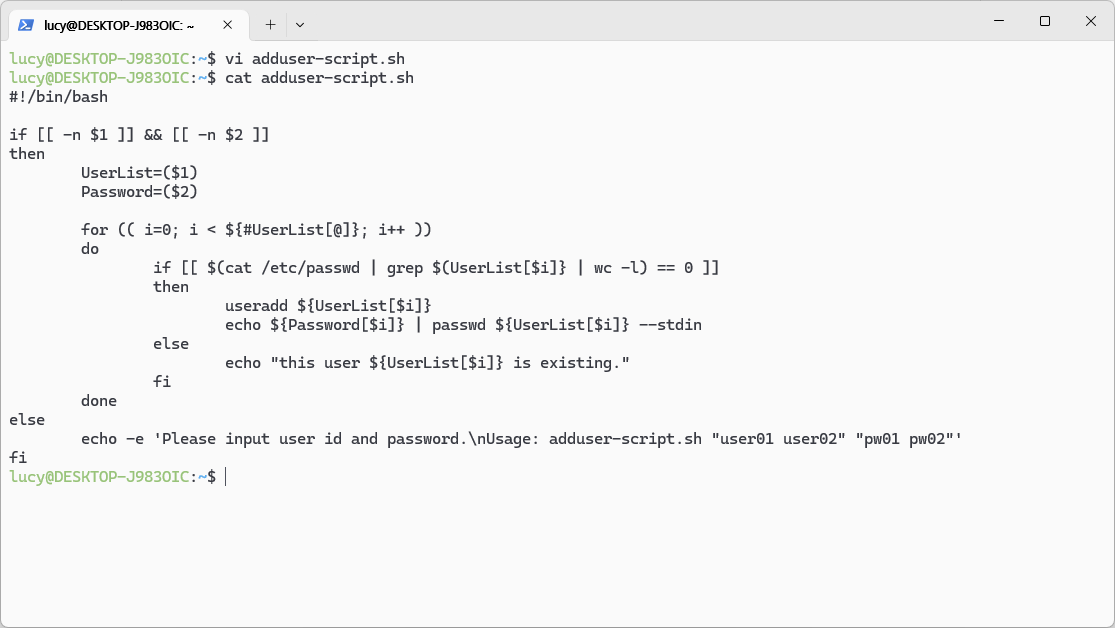 echo -e 'Please input user id and password.\nUsage: adduser-script.sh "user01 user02" "pw01 pw02"'