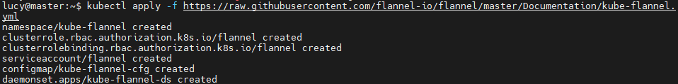 kubectl apply -f https://raw.githubusercontent.com/flannel-io/flannel/master/Documentation/kube-flannel.yml