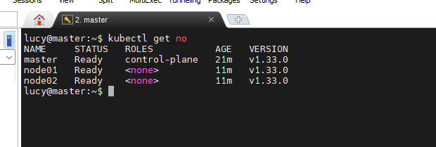 kubectl get nodes๋ก ํ์ธํ๋ฉด ์กฐ์ธ๋ ์์ปค ๋ ธ๋๋ค์ด Ready ์ํ์์ ํ์ธํ ์ ์์ต๋๋ค.