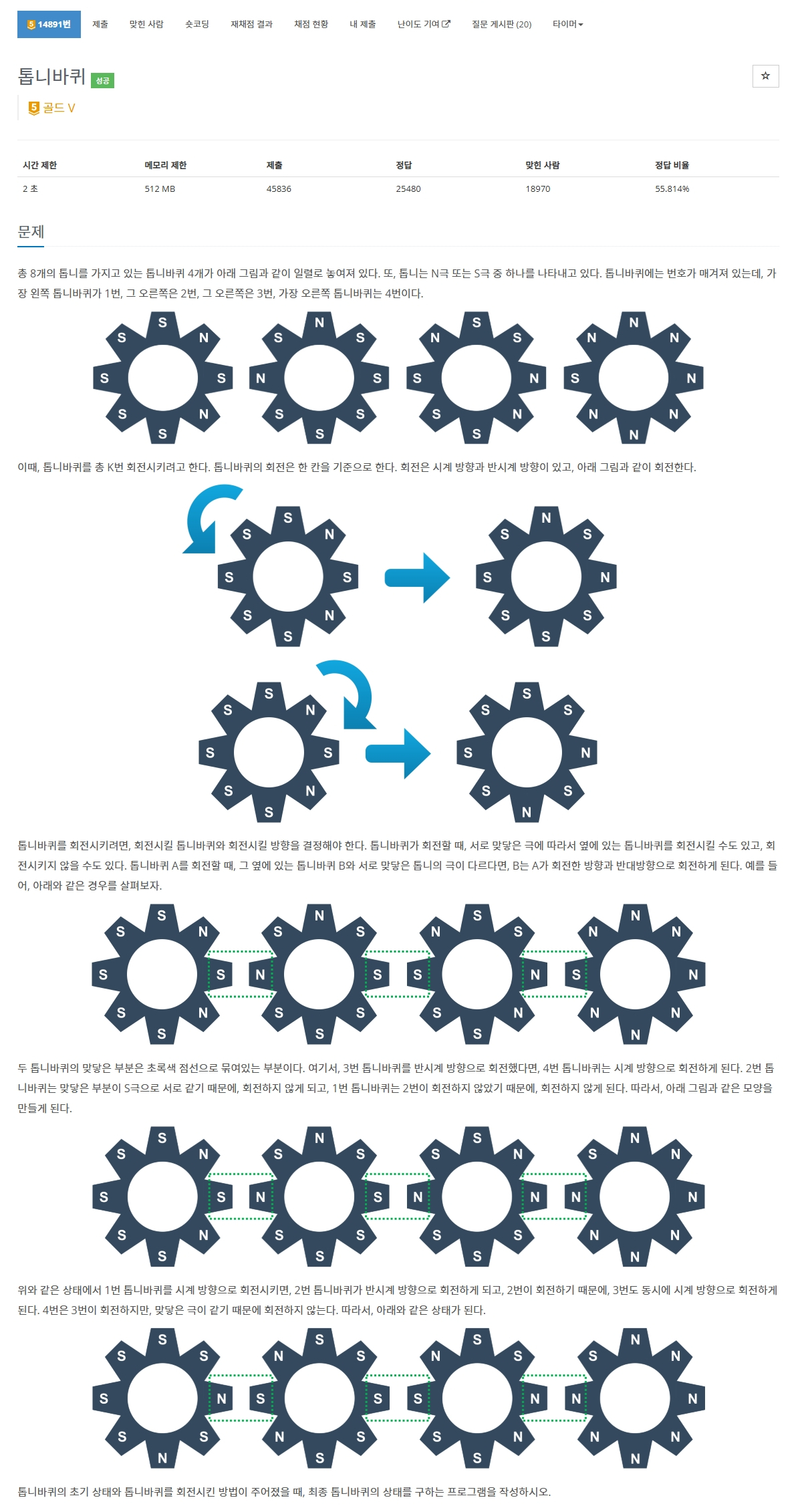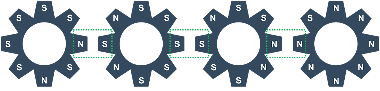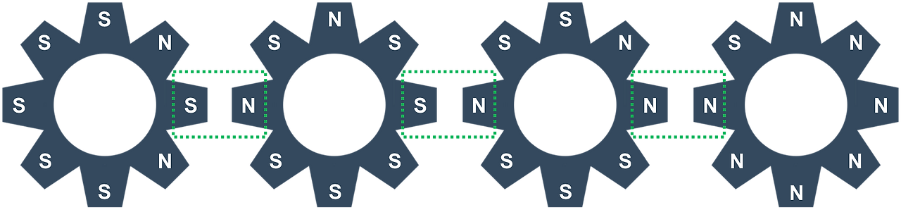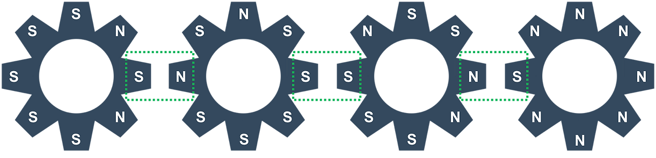 ์ด 8๊ฐ์ ํฑ๋๋ฅผ ๊ฐ์ง๊ณ ์๋ ํฑ๋๋ฐํด 4๊ฐ๊ฐ ์๋ ๊ทธ๋ฆผ๊ณผ ๊ฐ์ด ์ผ๋ ฌ๋ก ๋์ฌ์ ธ ์๋ค. ๋, ํฑ๋๋ N๊ทน ๋๋ S๊ทน ์ค ํ๋๋ฅผ ๋ํ๋ด๊ณ ์๋ค. ํฑ๋๋ฐํด์๋ ๋ฒํธ๊ฐ ๋งค๊ฒจ์ ธ ์๋๋ฐ, ๊ฐ์ฅ ์ผ์ชฝ ํฑ๋๋ฐํด๊ฐ 1๋ฒ, ๊ทธ ์ค๋ฅธ์ชฝ์ 2๋ฒ, ๊ทธ ์ค๋ฅธ์ชฝ์ 3๋ฒ, ๊ฐ์ฅ ์ค๋ฅธ์ชฝ ํฑ๋๋ฐํด๋ 4๋ฒ์ด๋ค.