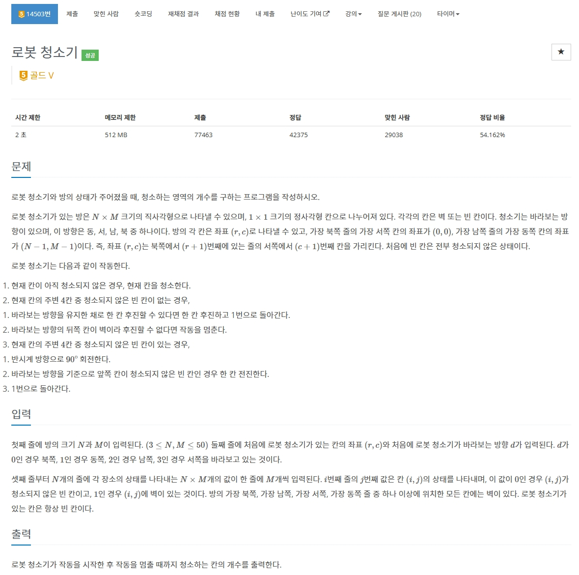 https://www.acmicpc.net/problem/14503 14503๋ฒ: ๋ก๋ด ์ฒญ์๊ธฐ์ฒซ์งธ ์ค์ ๋ฐฉ์ ํฌ๊ธฐ $N$๊ณผ $M$์ด ์ ๋ ฅ๋๋ค. $(3 \le N, M \le 50)$โ ๋์งธ ์ค์ ์ฒ์์ ๋ก๋ด ์ฒญ์๊ธฐ๊ฐ ์๋ ์นธ์ ์ขํ $(r, c)$์ ์ฒ์์ ๋ก๋ด ์ฒญ์๊ธฐ๊ฐ ๋ฐ