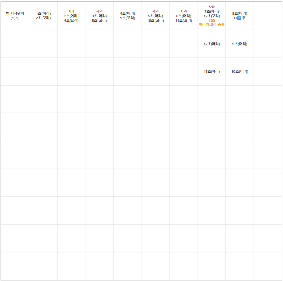- ๋จผ์ ๋ฑ์ ๋ชธ๊ธธ์ด๋ฅผ ๋๋ ค ๋จธ๋ฆฌ๋ฅผ ๋ค์์นธ์ ์์น์ํจ๋ค.