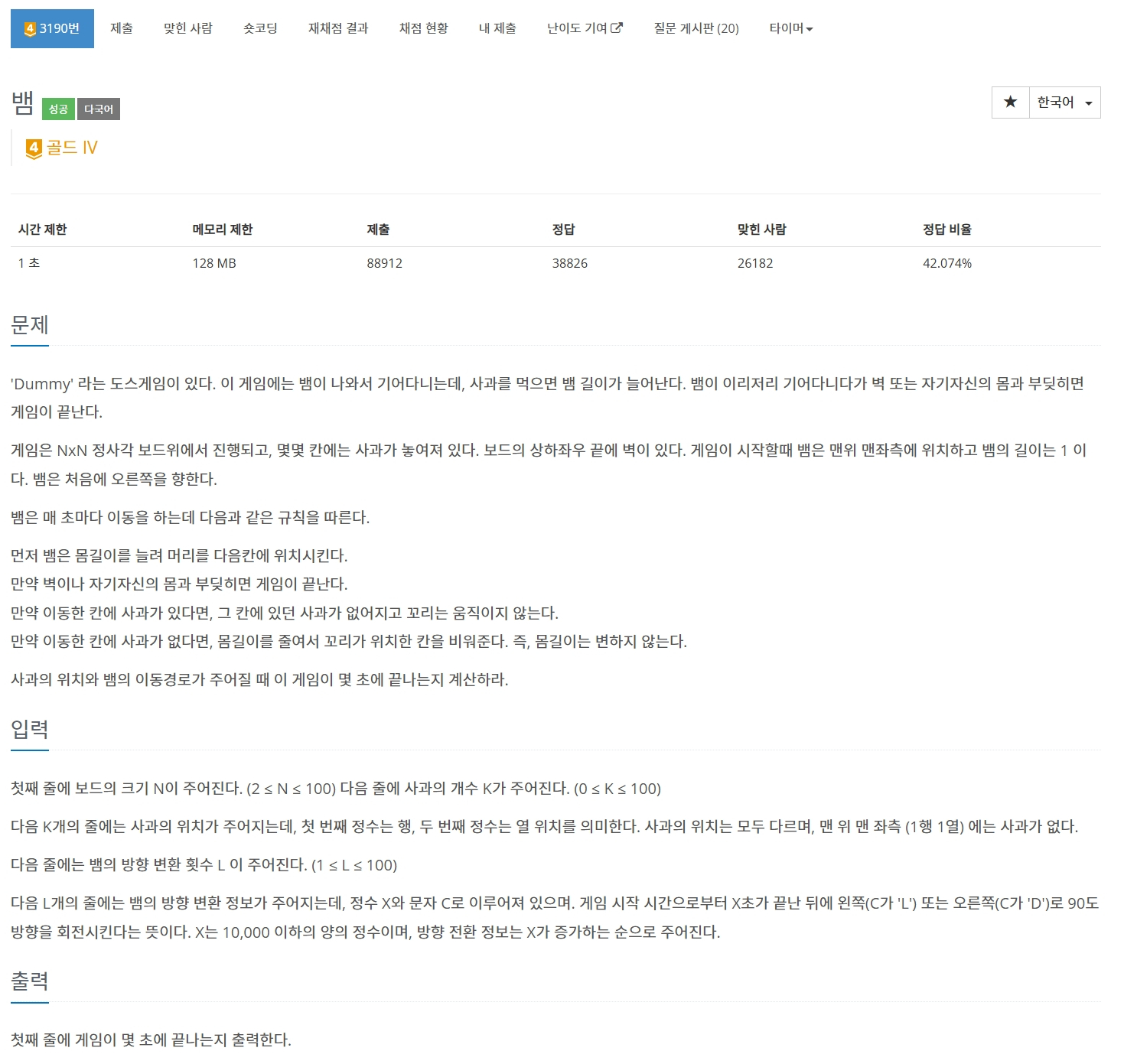 ๊ฒ์์ NxN ์ ์ฌ๊ฐ ๋ณด๋์์์ ์งํ๋๊ณ , ๋ช๋ช ์นธ์๋ ์ฌ๊ณผ๊ฐ ๋์ฌ์ ธ ์๋ค. ๋ณด๋์ ์ํ์ข์ฐ ๋์ ๋ฒฝ์ด ์๋ค. ๊ฒ์์ด ์์ํ ๋ ๋ฑ์ ๋งจ์ ๋งจ์ข์ธก์ ์์นํ๊ณ ๋ฑ์ ๊ธธ์ด๋ 1 ์ด๋ค. ๋ฑ์ ์ฒ์์ ์ค๋ฅธ์ชฝ์ ํฅํ๋ค.