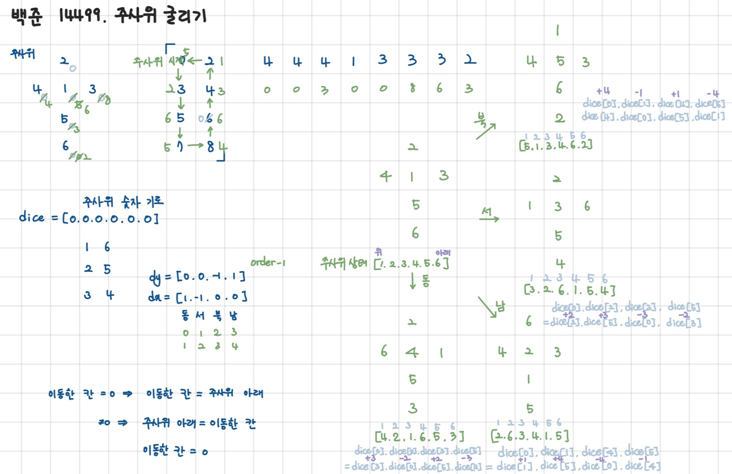 ๋ง์ฐฌ๊ฐ์ง๋ก ๋ถ์ชฝ์ผ๋ก ๊ตด๋ฆฐ๋ค๊ณ ํด๋ณด์. ๊ทธ๋ผ [1, 2, 3, 4, 5, 6] = [5, 1, 3, 4, 6, 2]๊ฐ ๋๋ค. ์ฌ๊ธฐ์๋ 3๊ณผ 4๋ง ๊ทธ๋๋ก ์์ผ๋ฏ๋ก 1, 2, 5, 6 = 5, 1, 6, 2๋ก ๋ฐ๊พธ๋ฉด ๋๋ค. ์์ชฝ๊ณผ ๋จ์ชฝ๋ ๋ง์ฐฌ๊ฐ์ง๋ก ํ๋ฉด ๋๋ค.