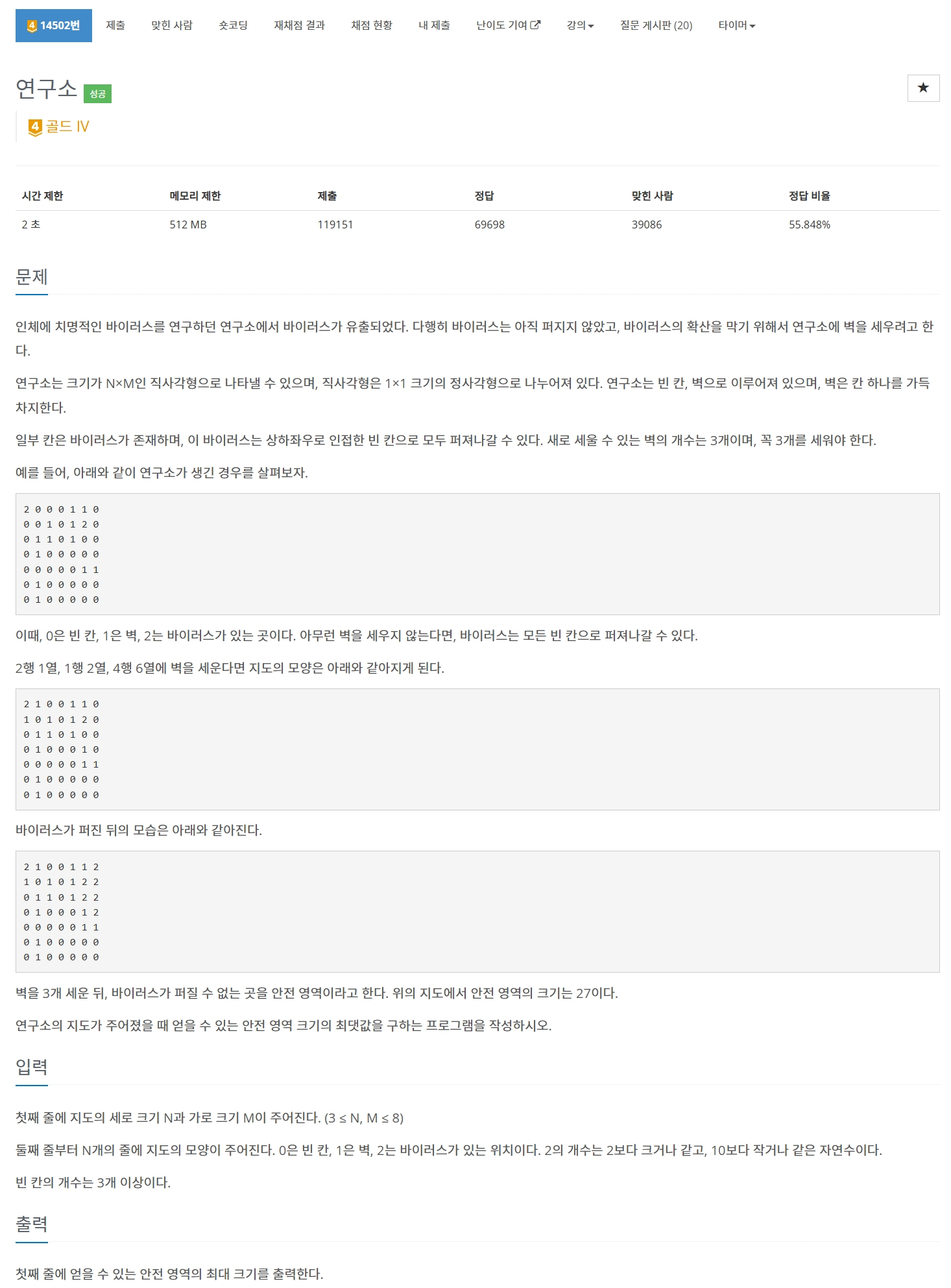์ด๋, 0์ ๋น ์นธ, 1์ ๋ฒฝ, 2๋ ๋ฐ์ด๋ฌ์ค๊ฐ ์๋ ๊ณณ์ด๋ค. ์๋ฌด๋ฐ ๋ฒฝ์ ์ธ์ฐ์ง ์๋๋ค๋ฉด, ๋ฐ์ด๋ฌ์ค๋ ๋ชจ๋ ๋น ์นธ์ผ๋ก ํผ์ ธ๋๊ฐ ์ ์๋ค.
