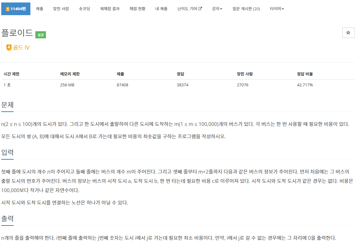 λͺ¨λ λμμ μ (A, B)μ λν΄μ λμ Aμμ Bλ‘ κ°λλ° νμν λΉμ©μ μ΅μκ°μ ꡬνλ νλ‘κ·Έλ¨μ μμ±νμμ€.
