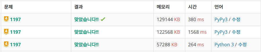 ์ฒ์์๋ ํฌ๋ฃจ์ค์ปฌ ์๊ณ ๋ฆฌ์ฆ์ ์ฌ์ฉํด์ ํ์๋๋ฐ PyPy3๋ recursion limit๋ฅผ 10^6์ผ๋ก ์ค์ ํ๋ฉด ๋ฉ๋ชจ๋ฆฌ๋ฅผ ์ด๊ณผํ์ฌ Python3๋ก๋ง ๊ฐ๋ฅํ๋ค. ๊ทธ๋ฌ๋ ์ผ์ฑ์ PyPy3๋ก ์ฌ์ฉํ๊ธฐ ๋๋ฌธ์ ํ๋ฆผ ์๊ณ ๋ฆฌ์ฆ์ผ๋ก ๋ค์ ํด๋ณด์๋๋ ํ๋ฆผ์ PyPy3์์ ๊ฐ๋ฅํ๋ค.