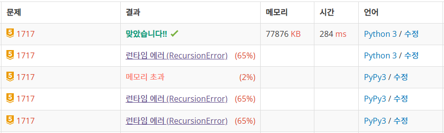 ์ต๋ ๊น์ด๊ฐ 1000์ด๋ผ์ ๊น์ด๋ฅผ ๋ฐ๊พธ์ง ์์ผ๋ฉด ์๋ฌ๊ฐ ๋๋ค. ๊ทธ๋ฐ๋ฐ PyPy3๋ ๊น์ด๋ฅผ ๋ฐ๊พธ๋ฉด ๋ฉ๋ชจ๋ฆฌ ์ด๊ณผ๊ฐ ๋ฐ์ํด์ ๊ฒฐ๊ตญ Python3๋ก ํ๊ฒ ๋์๋ค. ์ผ์ฑ์ PyPy3๋ก ์ฑ์ ํ๋ ๋ฐ ๊ทธ๋ผ ์ด๋ฐ ๊ฒฝ์ฐ์๋ ์ด๋ป๊ฒ ํด์ผ ํ ๊น...