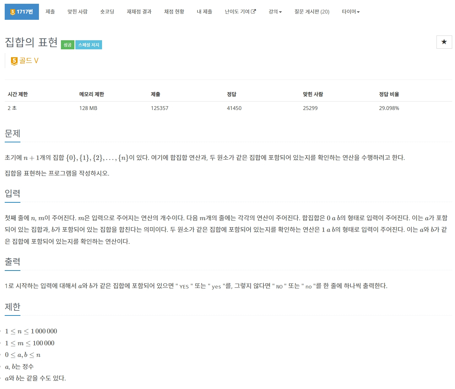 ์ด๊ธฐ์ n+1n+1๊ฐ์ ์งํฉ {0},{1},{2},…,{n}{0},{1},{2},…,{n}์ด ์๋ค. ์ฌ๊ธฐ์ ํฉ์งํฉ ์ฐ์ฐ๊ณผ, ๋ ์์๊ฐ ๊ฐ์ ์งํฉ์ ํฌํจ๋์ด ์๋์ง๋ฅผ ํ์ธํ๋ ์ฐ์ฐ์ ์ํํ๋ ค๊ณ ํ๋ค.