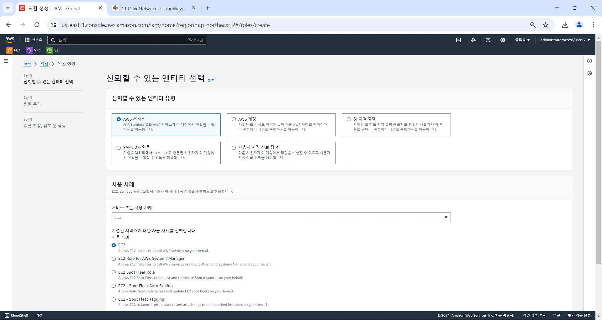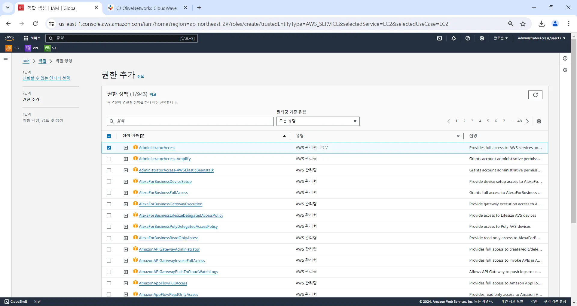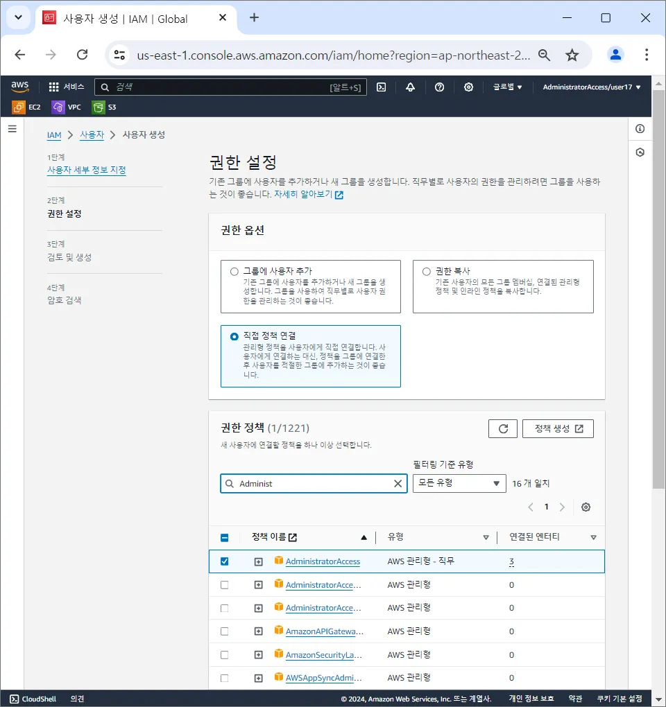 - ๊ถํ ์ต์ ฉ์์ ์ง์ ์ ์ฑ ์ฐ๊ฒฐ์ ์ ํํ๊ณ ๊ถํ ์ ์ฑ ์์ Administrator Access ๊ถํ์ ๋ถ์ฌํ๋ค.