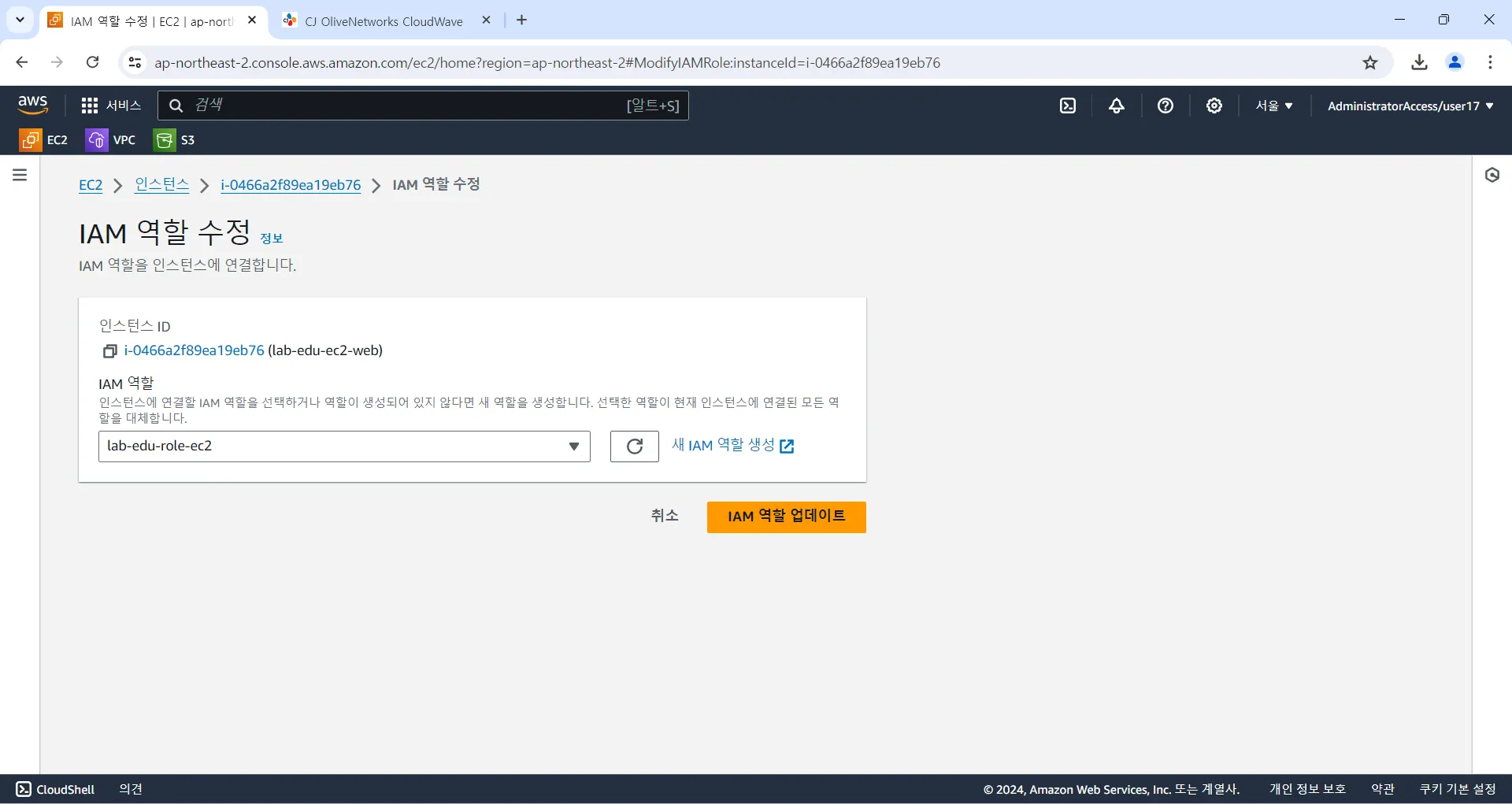 - ํด๋น ์ญํ ์ ์์ฑ๋์ด์๋ EC2์ ๋ถ์ฌํ๋ค.