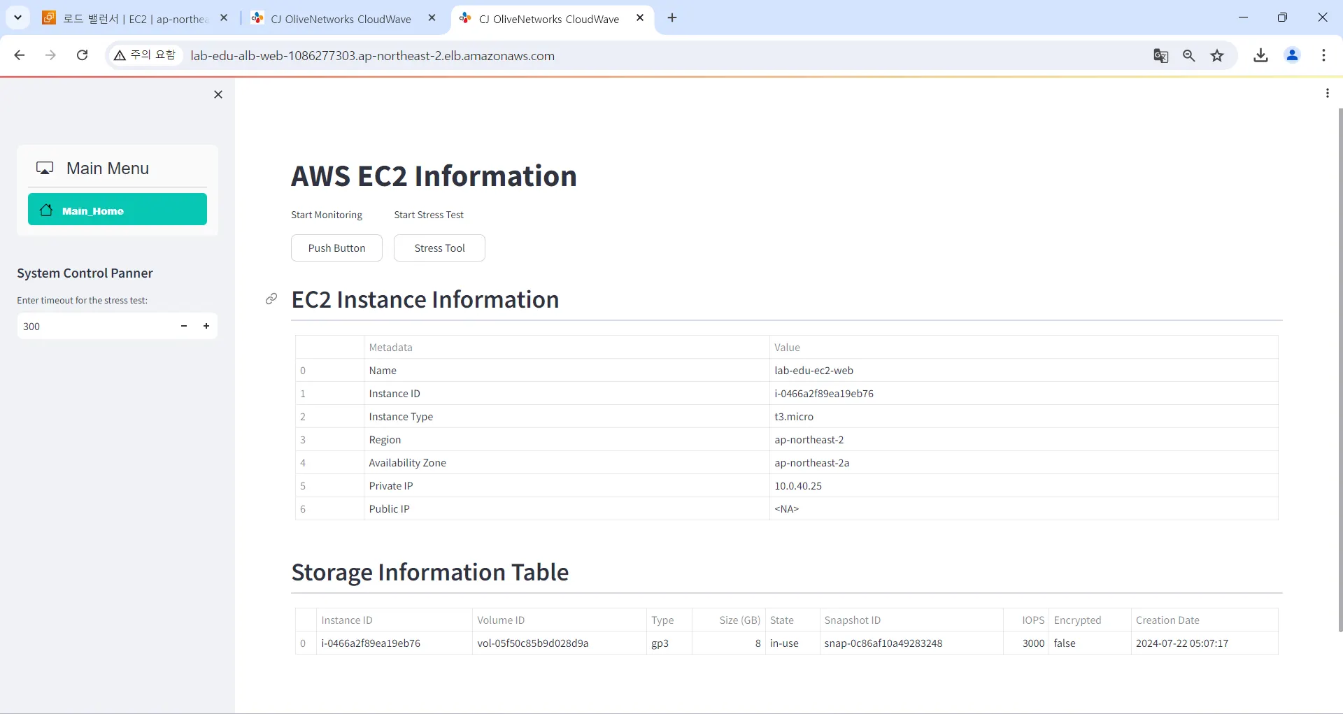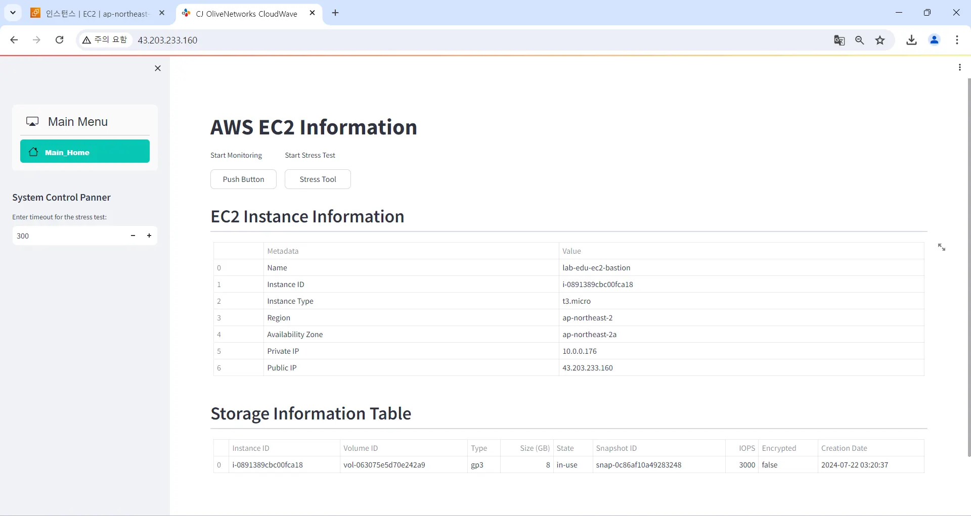 - ์ ๋ ฅํ ํ 80๋ฒ ํฌํธ๋ฅผ ์ด๊ณ ์ ์ํ๋ค. (Access Key์ Secret Key๋ฅผ ์ด์ฉํด EC2 ์ ๋ณด๋ฅผ ํ์ธํ ์ ์๋์ง ํ์ธํ๊ธฐ ์ํ ์์ ์ด๋ค.)