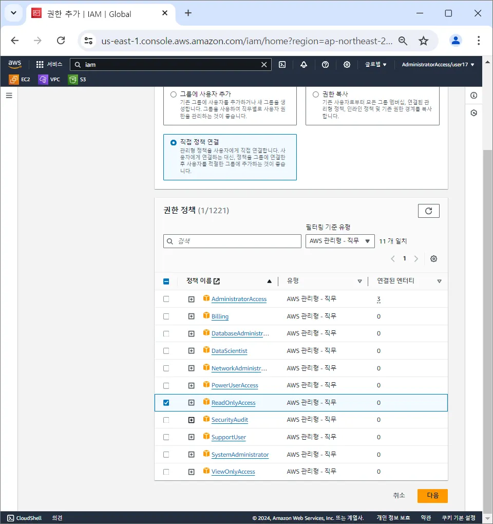 - ReadOnlyAccess ๊ถํ์ ๋ถ์ฌํ๋ค.