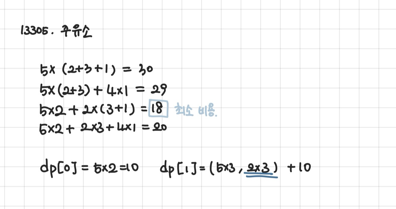 ์ด๋ํ๊ธฐ ์ํด์๋ ์ฒซ ์ฃผ์ ์์์๋ ๋ฌด์กฐ๊ฑด ์ฃผ์ ๋ฅผ ํด์ผ ํ๋ค. ๊ทธ๋ฌ๋ฏ๋ก dp[0]์ ์ฒซ ์ฃผ์ ์ ๊ฐ๊ฒฉ * ๋๋ก ๊ธธ์ด์ด๋ค.