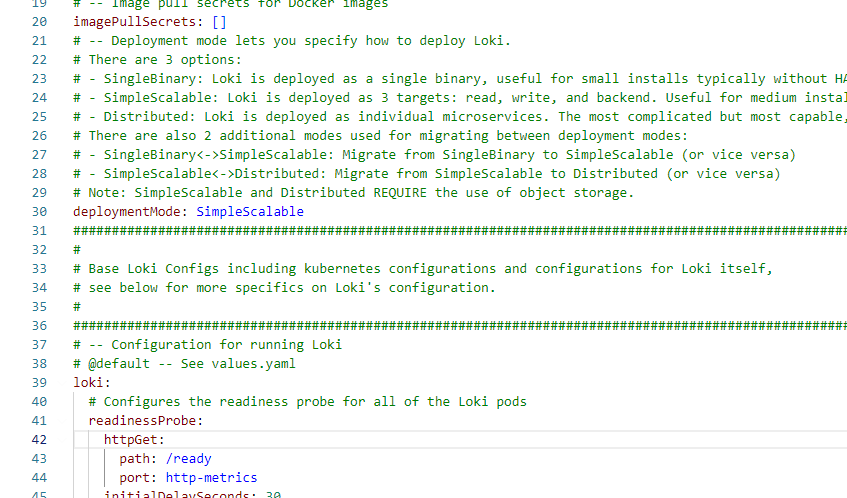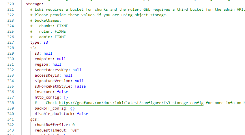 배치 모드는 Monolithic, SimpleScalable, Microservice가 있다. 기본적으로 SimpleScalable로 되어있다. 배치 모드는 구축하는 환경에 따라 배치모드를 선택하면 될 것 같다. SimpleScalable이나 Microservice의 경우 storage를 구성할 때 filesystem을 쓸 수 없으므로 Monolithic으로 바꿔주겠다. deploymentMode: SingleBinary로 적어주면 된다.