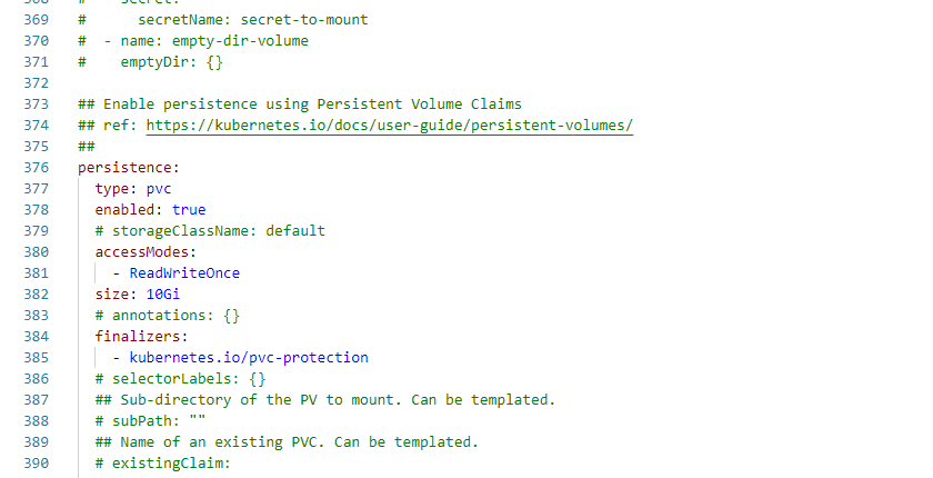 persistence.enabled는 기본적으로 false로 되어있다. 이 경우 grafana는 컨테이너의 파일시스템 내에 모든 데이터를 저장하게 된다. 컨테이너가 정지,재시작하거나 충돌하는 경우 데이터가 유실될 수 있다. 그러므로 true로 바꾸겠다.
