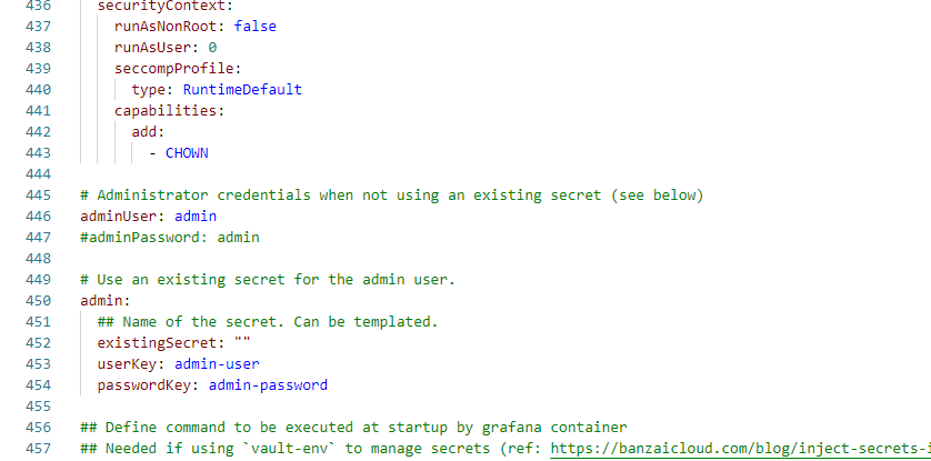 기본적으로 슈퍼 관리자 계정의 로그인 자격 증명은 secret을 통해 생성된다. 그러나 이는 쉽게 변경할 수 있다. 그러므로 adminPassword 부분에 주석을 해제하고 직접 설정해주겠다.