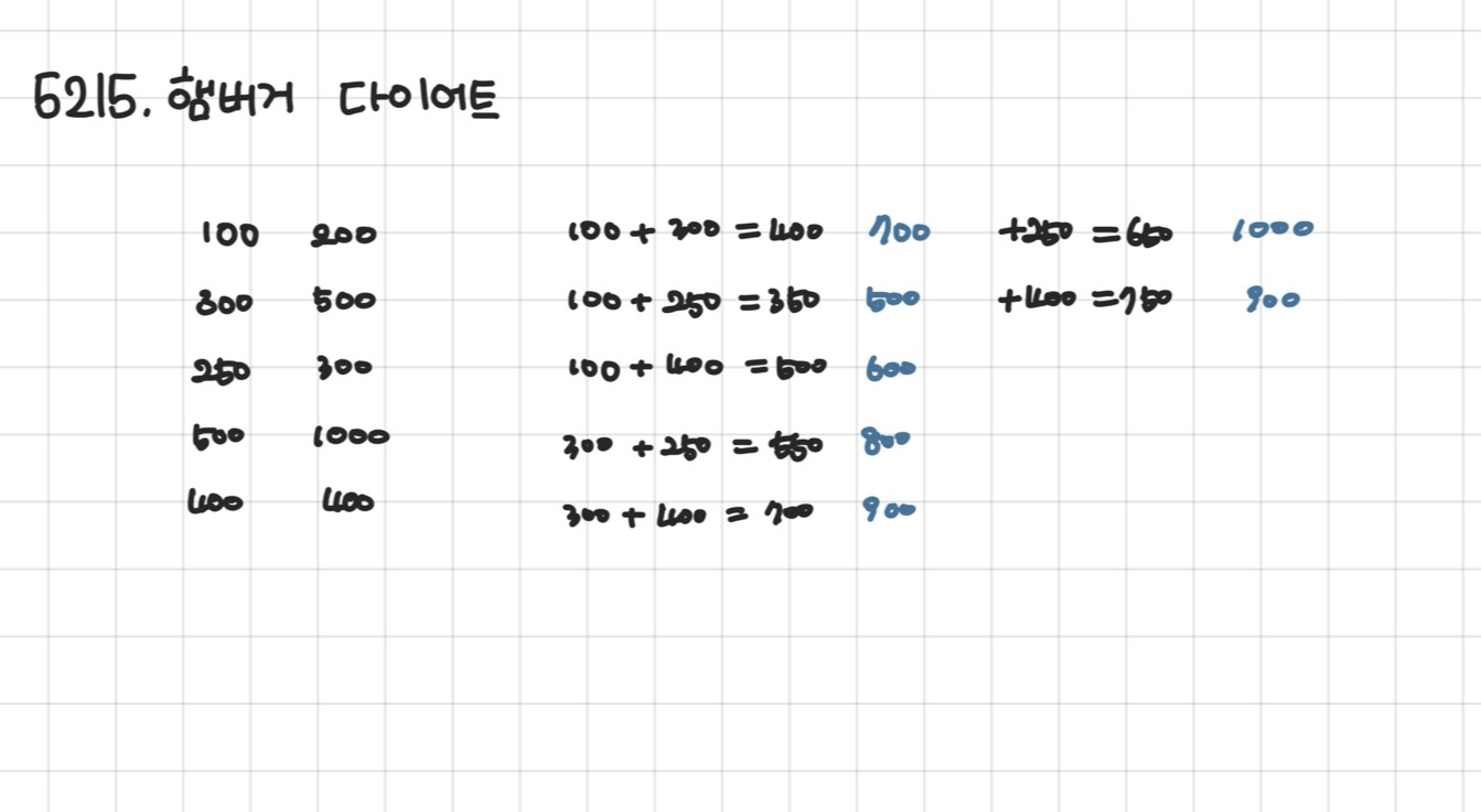 ์ฃผ์ด์ง ์ฌ๋ฃ๋ค์ ์ ์์ ์นผ๋ก๋ฆฌ๊ฐ ๊ฐ๊ฐ (100, 200), (300, 500), (250, 300), (500, 1000), (400, 400)์ด๋ผ๊ณ ํ๋ค๋ฉด