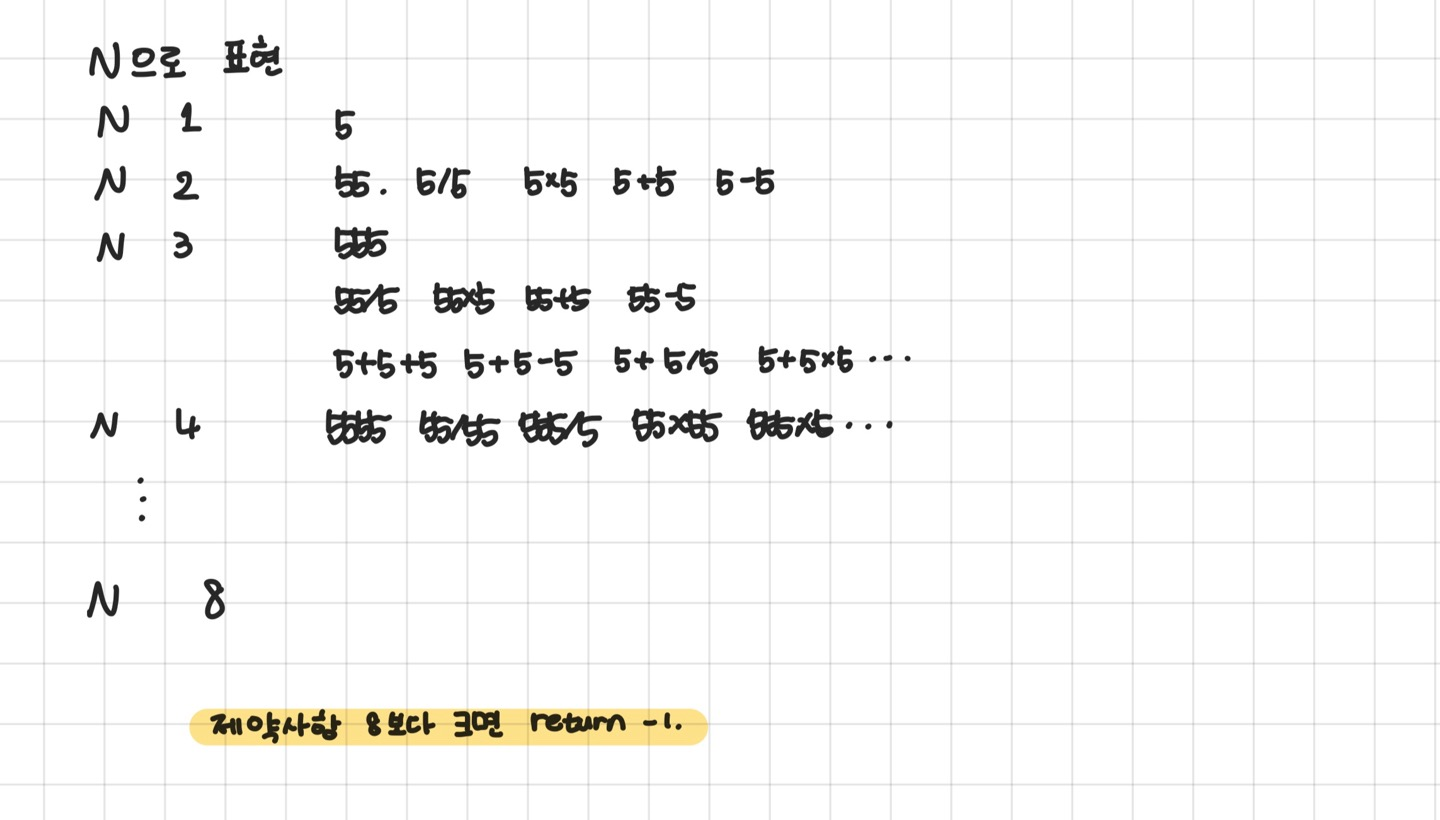 N์ ๋ ๋ฒ ์ฌ์ฉํ๋ ๊ฒฝ์ฐ๋ 55, 5/5, 5x5, 5+5, 5-5๊ฐ ์๋ค. ์ด๊ฑธ ์ ์๊ฐํด๋ณด๋ฉด N๊ณผ ์ฐ์ฐ์ ์กฐํฉ์ ์ด์ฉํ์ฌ ๋ ๋ฒ ์ฌ์ฉํ๋ ๊ฒฝ์ฐ๋ฅผ ๊ตฌํ ์ ์๋ค๋ ๊ฒ์ ์ ์ ์๋ค.