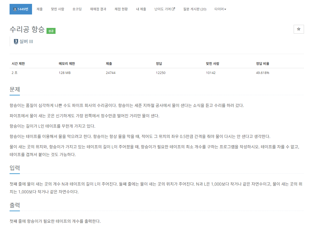 ๋ฌผ์ด ์๋ ๊ณณ์ ์์น์, ํญ์น์ด๊ฐ ๊ฐ์ง๊ณ ์๋ ํ ์ดํ์ ๊ธธ์ด L์ด ์ฃผ์ด์ก์ ๋, ํญ์น์ด๊ฐ ํ์ํ ํ ์ดํ์ ์ต์ ๊ฐ์๋ฅผ ๊ตฌํ๋ ํ๋ก๊ทธ๋จ์ ์์ฑํ์์ค. ํ ์ดํ๋ฅผ ์๋ฅผ ์ ์๊ณ , ํ ์ดํ๋ฅผ ๊ฒน์ณ์ ๋ถ์ด๋ ๊ฒ๋ ๊ฐ๋ฅํ๋ค.