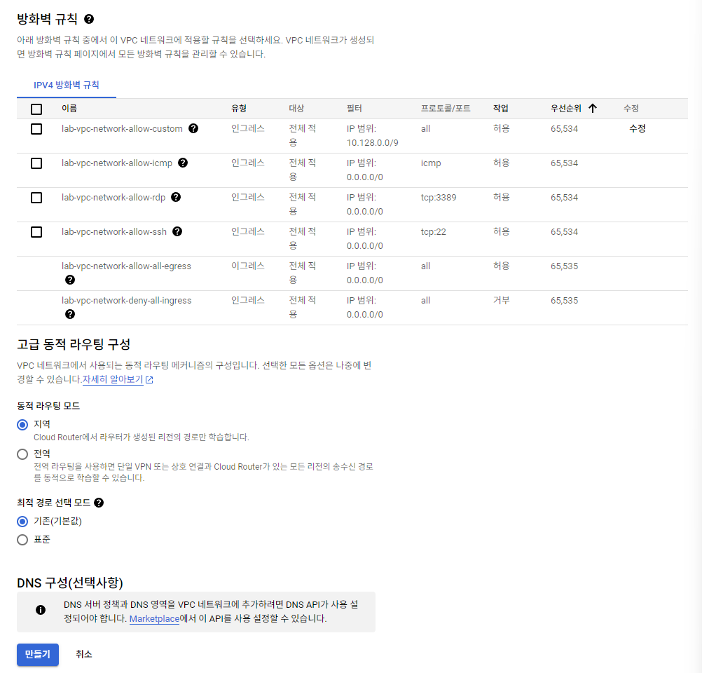default ๋คํธ์ํฌ์๋ ๋คํธ์ํฌ์ ์ธ์คํด์ค ๊ฐ ํต์ ์ ํ์ฉํ๋ default-allow-internal ๊ท์น์ ๋น๋กฏํ ์ถ๊ฐ ๋ฐฉํ๋ฒฝ ๊ท์น์ด ์๋ค.