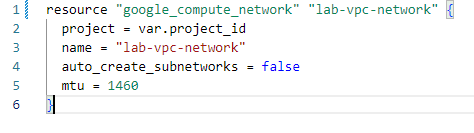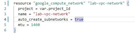 auto_create_subnetworks๋ฅผ false๋ก ์ค์ ํ๋ฉด IPv4 ์๋ธ๋ท๋ง ์๋ ์ปค์คํ ๋ชจ๋ VPC ๋คํธ์ํฌ๋ฅผ ๋ง๋๋ ๊ฒ์ด๋ค. ์๋ธ๋ท์ ์์ฑํ๋ ์ฝ๋๋ ์๋์ ๊ฐ์ด ์์ฑํ๋ฉด ๋๋ค.