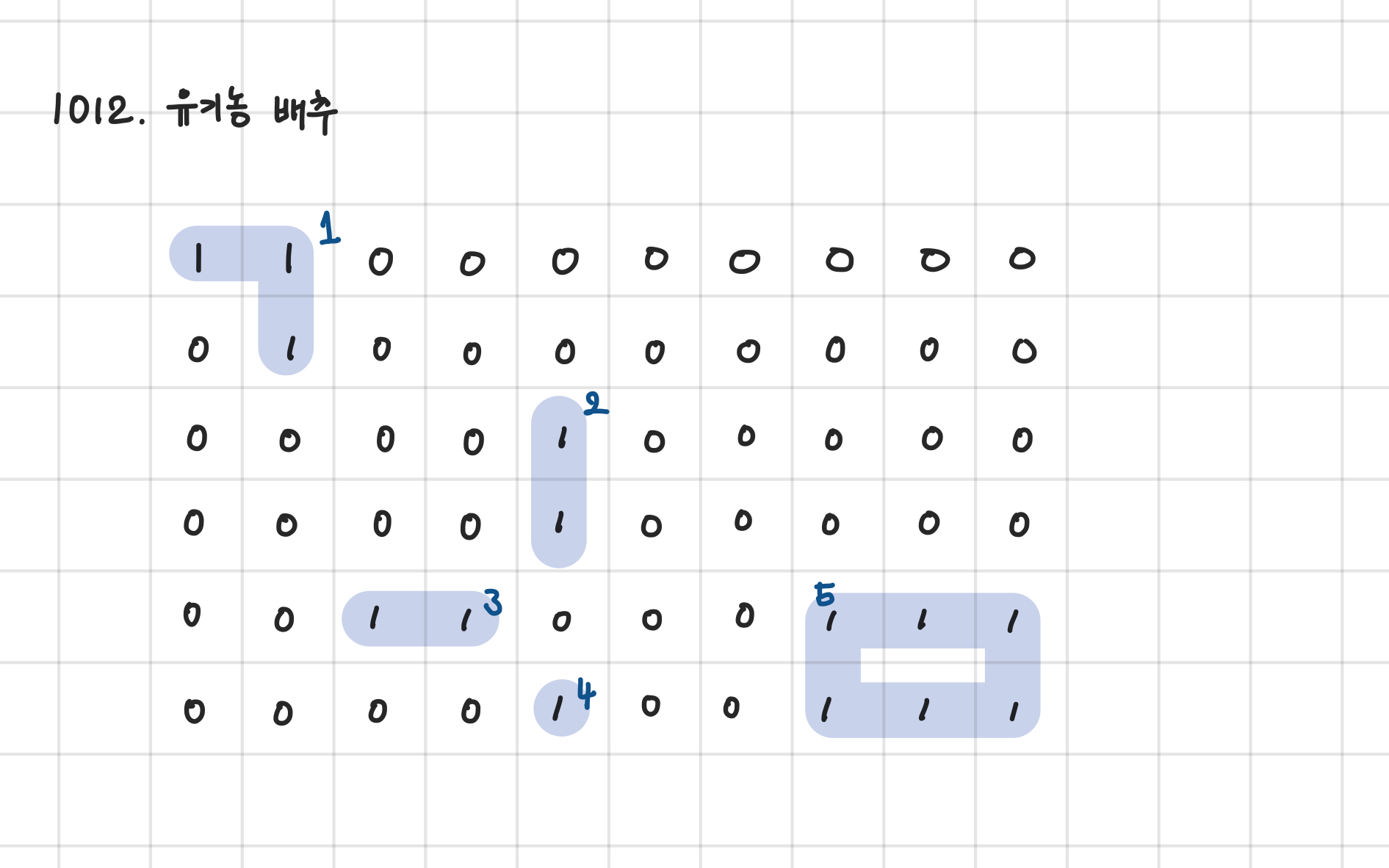 ํ๋๊ฐ ๋ฐฐ์ถ๋ฅผ ์ฌ๋ฐฐํ๋ ๋ ์ ๊ณ ๋ฅด์ง ๋ชปํด์ ๋ฐฐ์ถ๋ฅผ ๊ตฐ๋ฐ๊ตฐ๋ฐ ์ฌ์ด ๋์๋ค. ๋ฐฐ์ถ๋ค์ด ๋ชจ์ฌ์๋ ๊ณณ์๋ ๋ฐฐ์ถํฐ์ง๋ ์ด๊ฐ ํ ๋ง๋ฆฌ๋ง ์์ผ๋ฉด ๋๋ฏ๋ก ์๋ก ์ธ์ ํด์๋ ๋ฐฐ์ถ๋ค์ด ๋ช ๊ตฐ๋ฐ์ ํผ์ ธ์๋์ง ์กฐ์ฌํ๋ฉด ์ด ๋ช ๋ง๋ฆฌ์ ์ง๋ ์ด๊ฐ ํ์ํ์ง ์ ์ ์๋ค. ์๋ฅผ ๋ค์ด ๋ฐฐ์ถ๋ฐญ์ด ์๋์ ๊ฐ์ด ๊ตฌ์ฑ๋์ด ์์ผ๋ฉด ์ต์ 5๋ง๋ฆฌ์ ๋ฐฐ์ถํฐ์ง๋ ์ด๊ฐ ํ์ํ๋ค. 0์ ๋ฐฐ์ถ๊ฐ ์ฌ์ด์ ธ ์์ง ์์ ๋ ์ด๊ณ , 1์ ๋ฐฐ์ถ๊ฐ ์ฌ์ด์ ธ ์๋ ๋ ์ ๋ํ๋ธ๋ค.