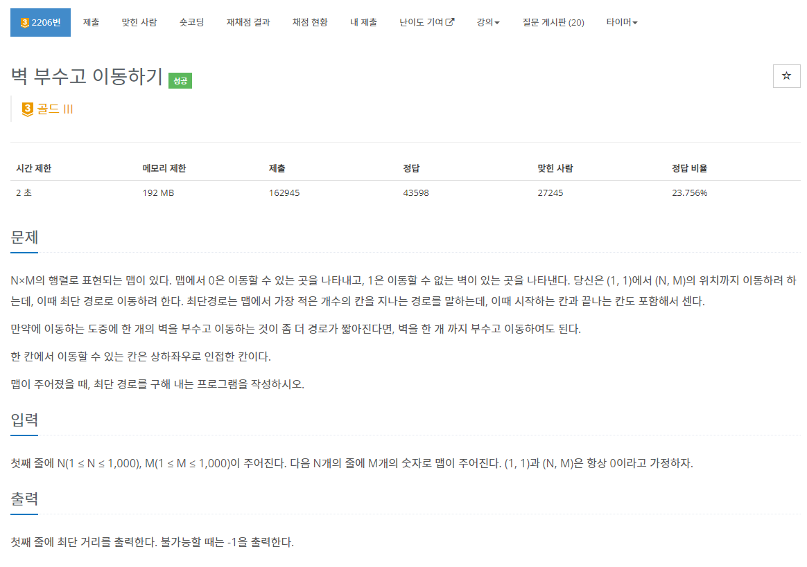 λ§μ½ λ€μ μμΉκ° 1μ΄κ³ μμ§ λΆμ μ μ΄ μλ€λ©΄ visted[ny][nx][1] = visited[cy][cx][0] + 1μ νμ¬ κΈ°λ‘νλ€. κ·Έλ μ§ μκ³ λ€μ μμΉκ° 0μ΄κ³ μμ§ λ°©λ¬Έν μ μλ κ³³μ΄λΌλ©΄ visited[ny][nx][crack] = visited[cy][cx][crack] + 1μ νμ¬ κΈ°λ‘νλ©΄ λλ€. μ¬κΈ°μ crackμ λ²½μ λΆμλμ§ λΆμμ§ μμλμ§λ₯Ό μλ―Ένλ€.